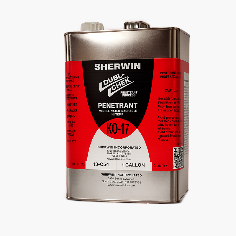 KO-17 hi-temp penetrant is a visible dye penetrant used to find flaws on surfaces at elevated temperatures, up to 3500F (176.70C). KO-17 saves time for weldmet inspection allowing the inspection to take place at pre-heated temperatures. Complies with low sulfur and low halogen requirements. Because KO-17 works at high temperatures, the heat drives contaminants from flaws and heat-expanded flaws trap more penetrant, giving stronger indications.